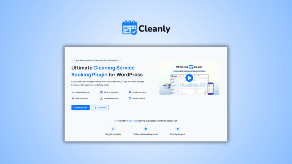 Manage your cleaning service business online. Bookings, schedules, and payments all in one simple WordPress solution.